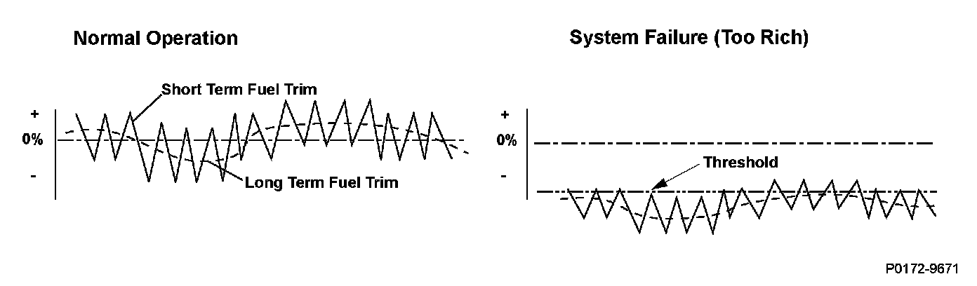The engine control module (ECM) detects the oxygen content in the exhaust gas from the front air/fuel ratio (A/F) sensor bank 2, sensor 1) signal voltage, and it uses fuel feedback control to maintain the optimal air/fuel ratio. The air/fuel ratio coefficient for correcting the amount of injected fuel is the short term fuel trim. The ECM varies short term fuel trim continuously to keep the air/fuel ratio close to the stoichiometric ratio for all driving conditions. Long term fuel trim is computed from short term fuel trim and is used to regulate long term deviation from the stoichiometric air/fuel ratio, which occurs when fuel metering components deteriorate with age or system failures occur. In addition, long term fuel trim is stored in the ECM memory and is used to determine when fuel metering components malfunction. When long term fuel trim is higher than normal, which is about 1.0 (0 %), the amount of injected fuel must be increased, and when lower than normal, it must be decreased. If long term fuel trim is lower than normal (too rich), a malfunction in the fuel metering components is detected and a DTC is stored.