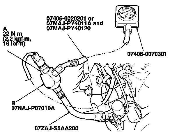 19. Remove the rocker arm oil pressure switch (A), and attach the special tools as shown, then attach the rocker arm oil pressure switch to the pressure gauge adapter (B).