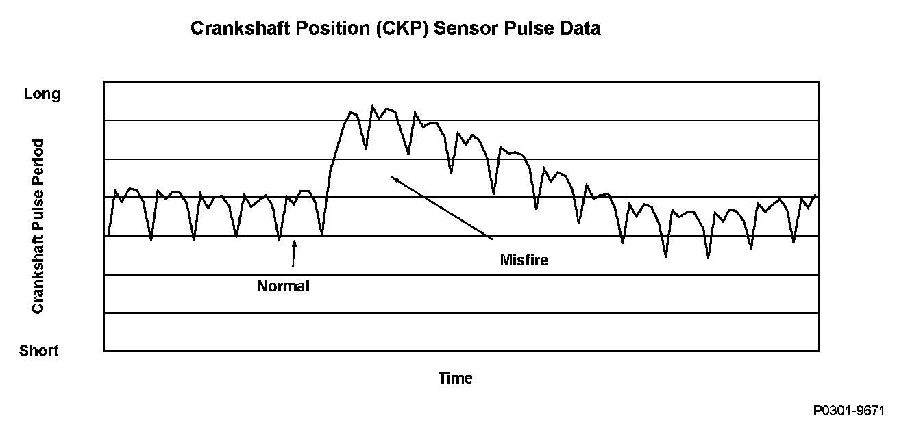 The crankshaft vibrates slightly when each cylinder fires. If a misfire occurs, the crankshaft rotation speed changes rapidly. The engine control module (ECM) monitors engine misfiring based on the output pulses from the crankshaft position (CKP) sensor, counts the number of misfires, and determines which cylinder is misfiring. If a misfire is detected, a DTC is stored.