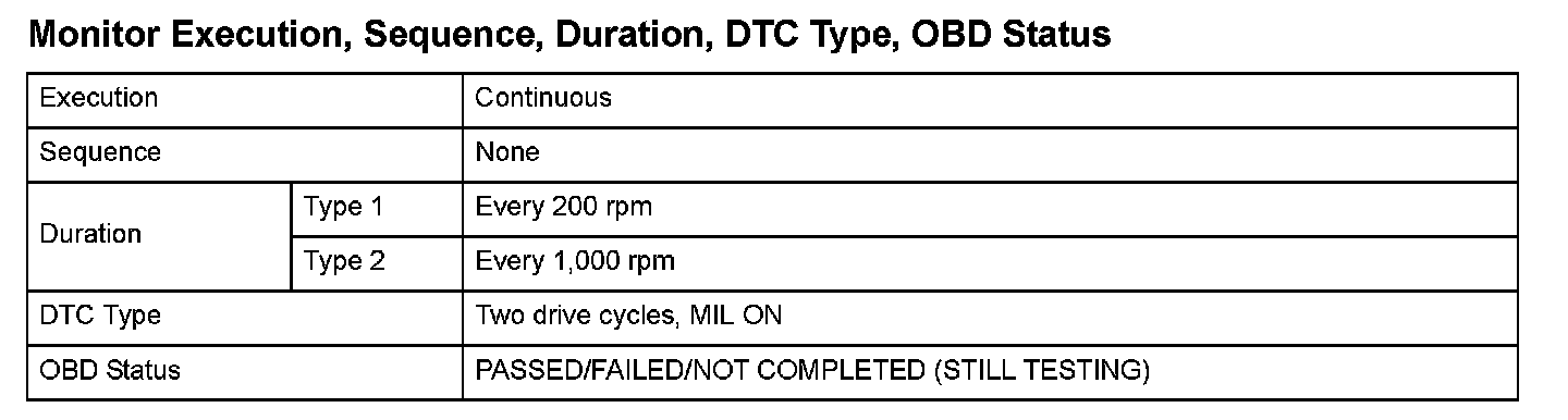 Monitor Execution, Sequence, Duration, DTC Type, OBD Status