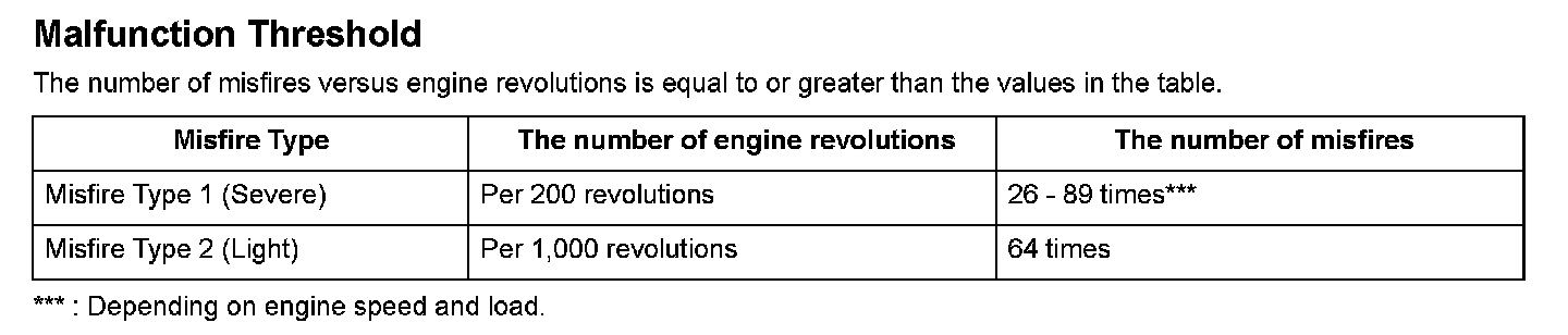 Type 1 (1 drive cycle): When the number of misfires per 200 engine revolutions reaches the level that damages the three way catalyst (TWC), a DTC is stored and the MIL blinks. When the misfire ceases, the MIL remains on steady instead of blinking.