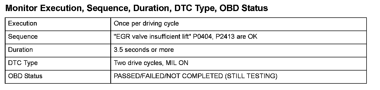 Monitor Execution, Sequence, Duration, DTC Type, OBD Status