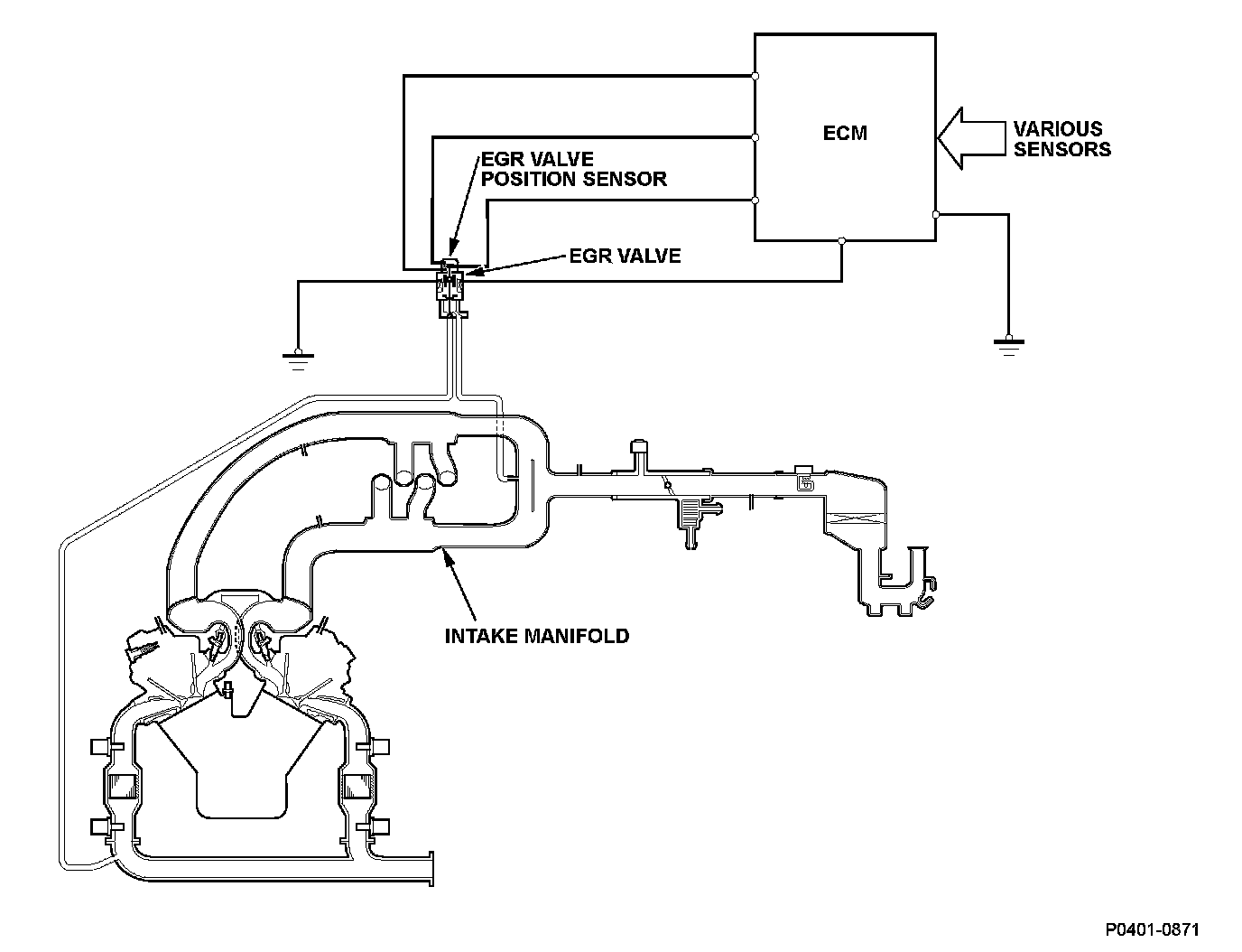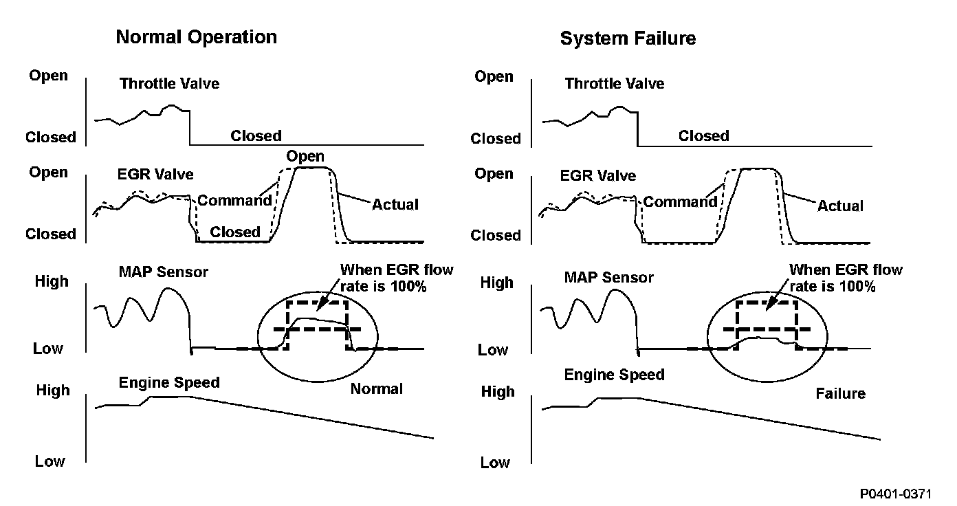The exhaust gas recirculation (EGR) valve, which is controlled by the engine control module (ECM), is opened and the exhaust gas flows from the exhaust manifold through the EGR valve and the intake manifold and the EGR passage. the exhaust gas is circulated into the air/fuel mixture to lower combustion temperatures, thus reducing oxides of nitrogen (NOx) emissions. The EGR flow is inspected as follows. The EGR valve is closed during deceleration with the throttle valve fully closed. Then the ECM fully opens the EGR valve. After set time, the ECM computes the ratio of the present EGR flow to the normal EGR flow by monitoring the fluctuation of the intake manifold pressure between when the EGR valve is fully opened and when it is fully closed. If the EGR flow rate is lower than normal, a malfunction is detected and a DTC is stored.