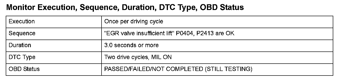 Monitor Execution, Sequence, Duration, DTC Type, OBD Status