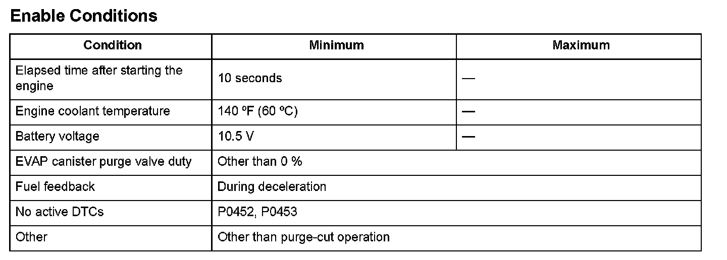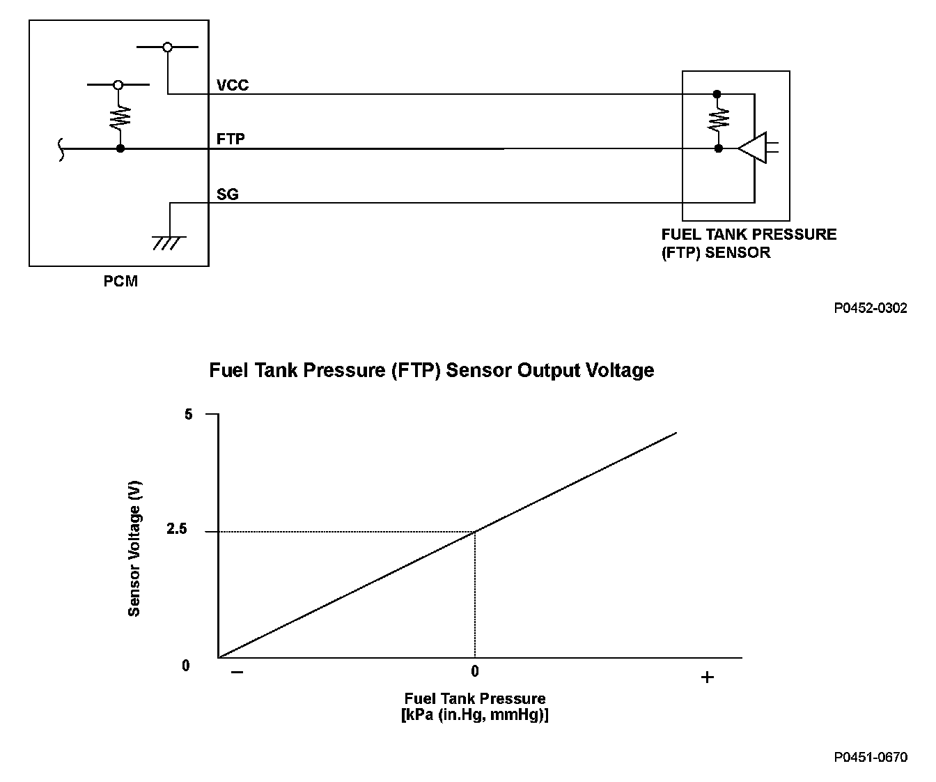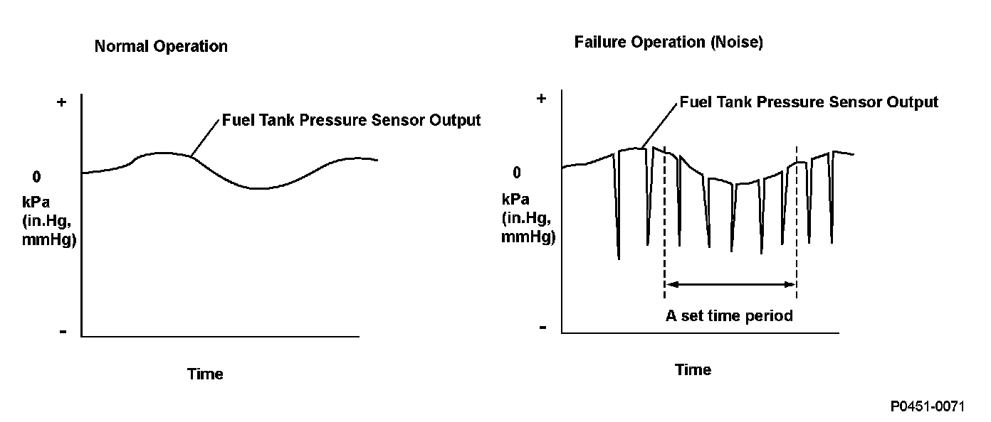 The fuel tank pressure (FTP) sensor is installed on the evaporative emission (EVAP) canister. The FTP sensor is used to detect leaks in the EVAP system. The powertrain control module (PCM) monitors the FTP sensor output voltage. The FTP sensor output voltage rises as the fuel tank pressure increases. Conversely, the FTP sensor output voltage drops as the fuel tank pressure decreases. Rapid changes in the FTP sensor output voltage due to electrical noise or an intermittent open during the EVAP leak detection may cause incorrect leak detection, so abnormal output is monitored. If the FTP sensor output voltage changes a specified ratio arisen within a set time, the PCM detects a malfunction and stores a DTC.