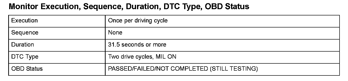 Monitor Execution, Sequence, Duration, DTC Type, OBD Status