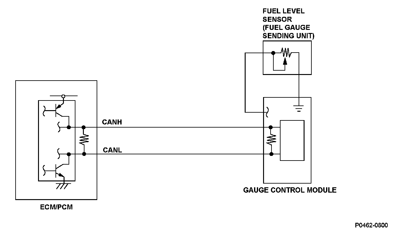 The fuel level sensor (fuel gauge sending unit) is incorporated into the fuel pump and installed in the fuel tank. Using a built-in potentiometer and float, it converts the movement of the float to electrical signals as an output that corresponds to fuel level variations in the fuel tank. The fuel level, which is indicated by the gauge control module, is sent to the engine control module (ECM)/powertrain control module (PCM) via the controller area network (CAN). If the ECM/PCM detects a signal from the fuel level sensor (fuel gauge sending unit) below a predetermined value for a set time or more, it detects a malfunction and stores a DTC.