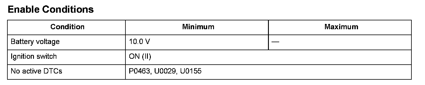 The fuel level sensor (fuel gauge sending unit) output voltage is 0.10 V or less for at least 5 seconds.