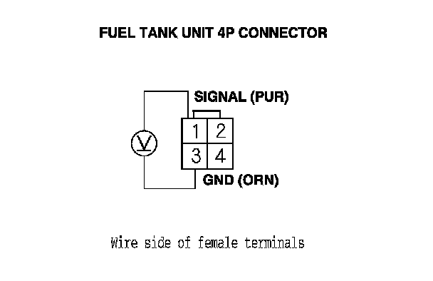 9. Measure the voltage between fuel tank unit 4P connector terminals No. 1 and No. 3.