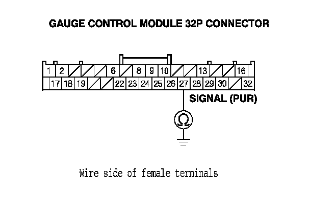 16. Check for continuity between gauge control module 32P connector terminal No. 27 and body ground.