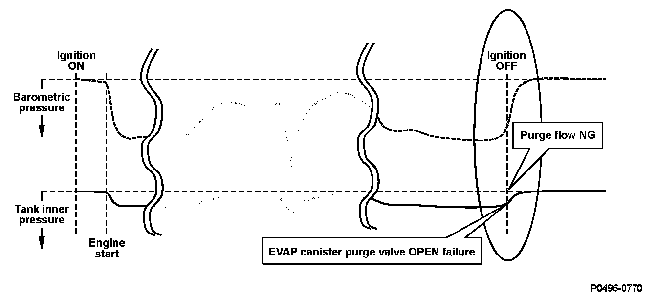 The EVAP canister purge valve opens normally (EVAP canister purge valve OPEN OK) and detects that the purge flow is normal when the pulse of the EVAP canister purge valve duty cycle is transmitted to the fuel tank pressure (FTP) sensor (pulse method).