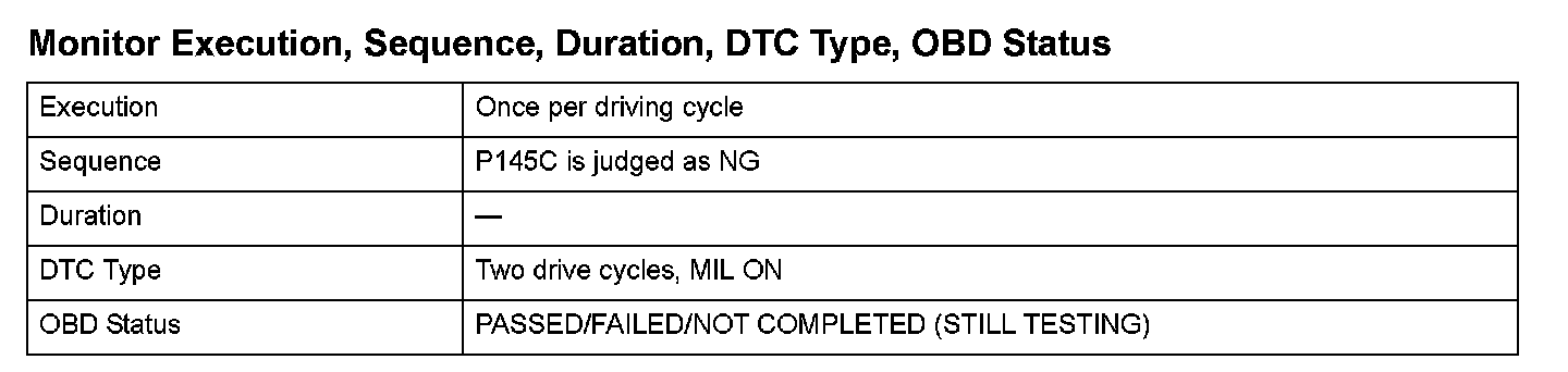 Monitor Execution, Sequence, Duration, DTC Type, OBD Status