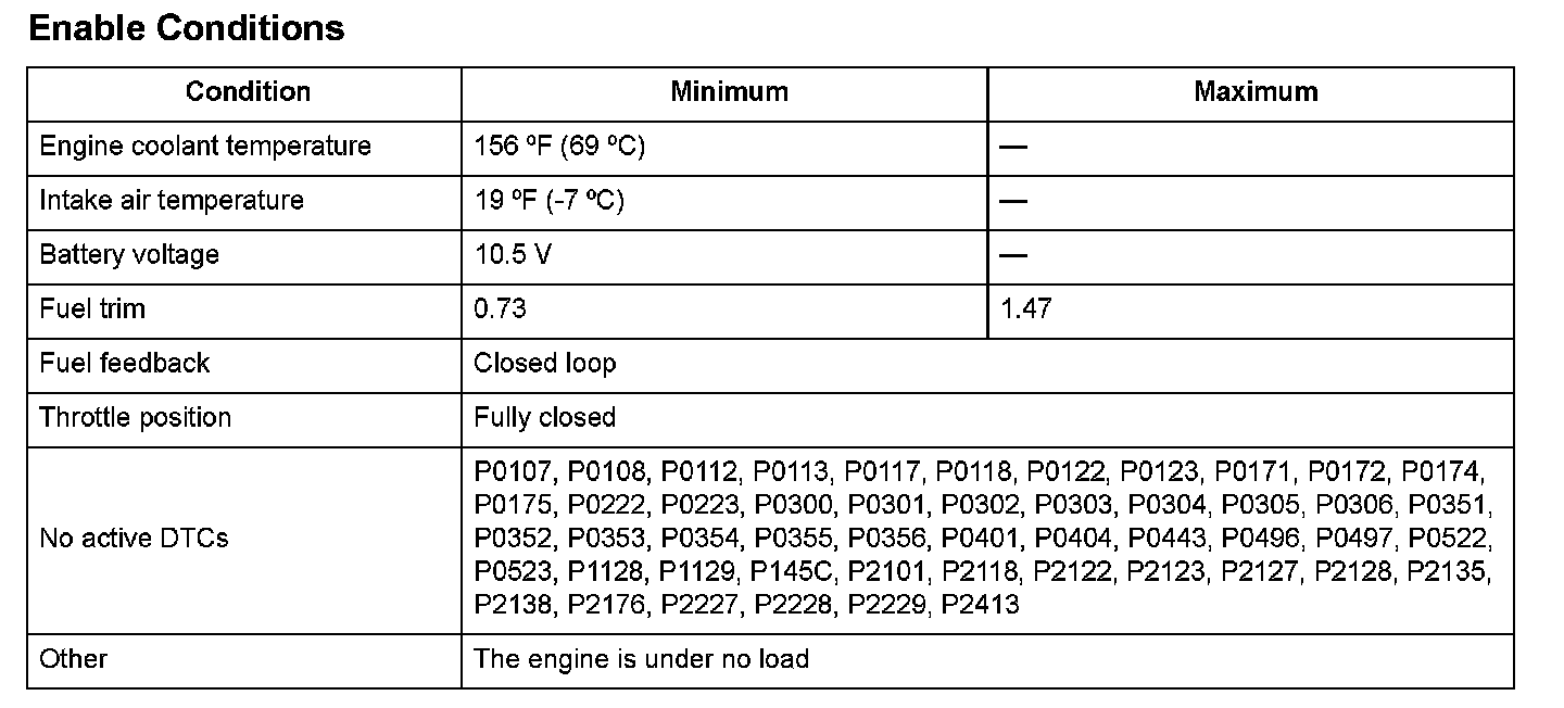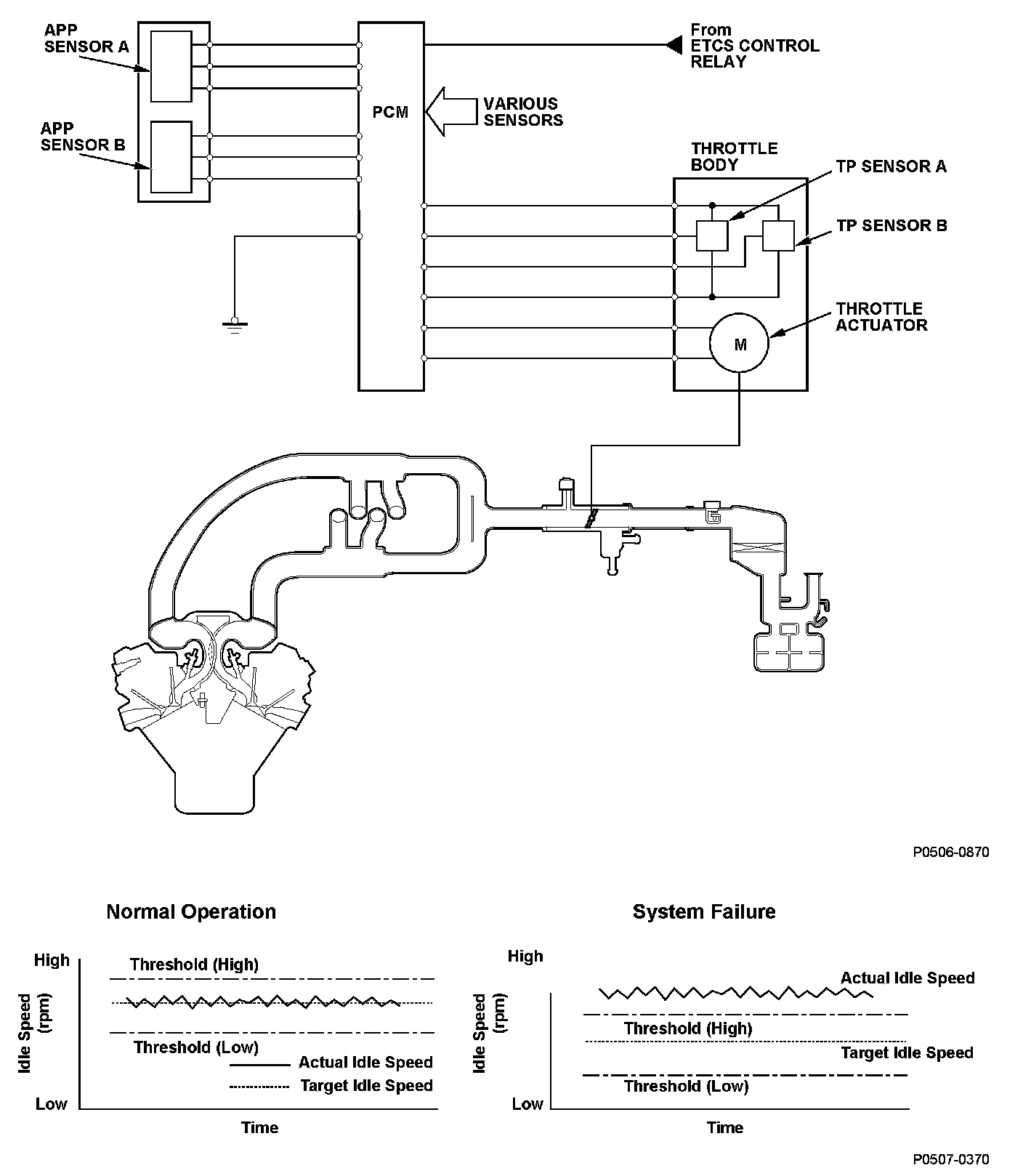 A target idle speed that meets the engine operating conditions (coolant temperature, A/C ON or OFF, etc.) is stored in the powertrain control module (PCM). The PCM monitors and controls the idle speed so that the actual idle speed is equal to the target idle speed. If the actual idle speed varies beyond a specified value from the target speed over a certain period of time, the PCM detects a malfunction in the idle speed control system and a DTC is stored.