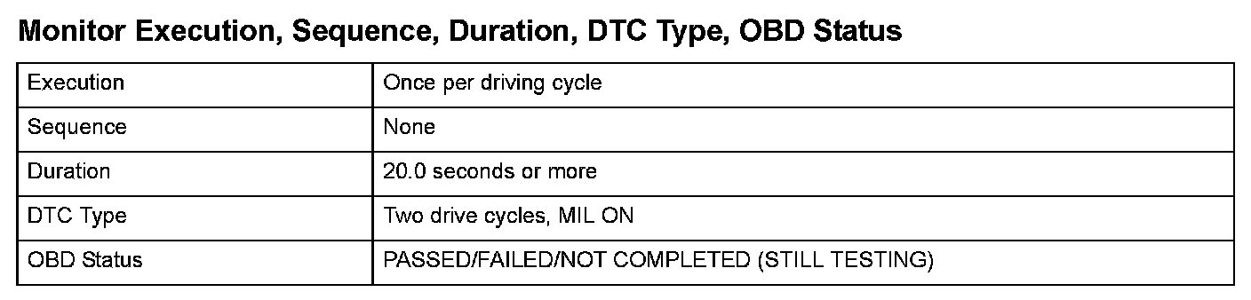 Monitor Execution, Sequence, Duration, DTC Type, OBD Status