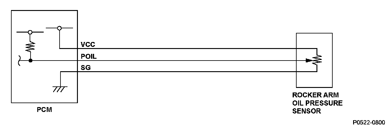 The rocker arm oil pressure sensor detects the engine oil pressure of the variable cylinder management (VCM) system. When the voltage from the rocker arm oil pressure sensor is a set value or less for a specified time, the powertrain control module (PCM) detects a malfunction and a DTC is stored.
