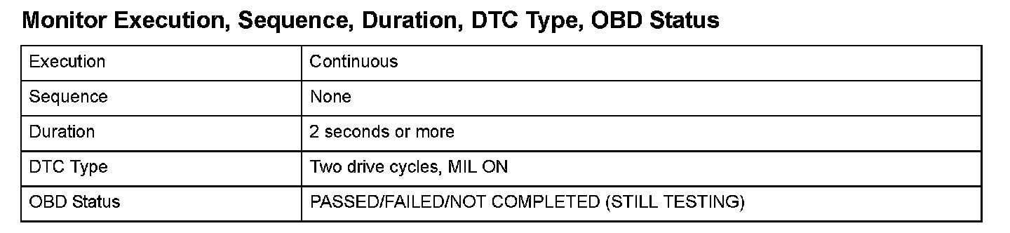Monitor Execution, Sequence, Duration, DTC Type, OBD Status