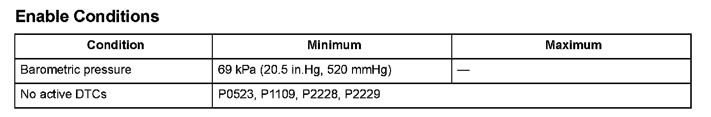 The barometric pressure (BARO) sensor is 69 kPa (20.5 in.Hg, 520 mmHg) or more and the rocker arm oil pressure sensor voltage is 0.18 V or less for at least 2 seconds.