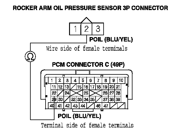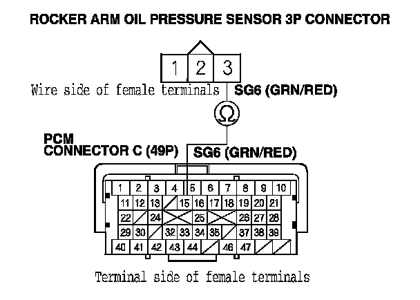 13. Check for continuity between PCM connector terminal C15 and rocker arm oil pressure sensor 3P connector terminal No. 3.