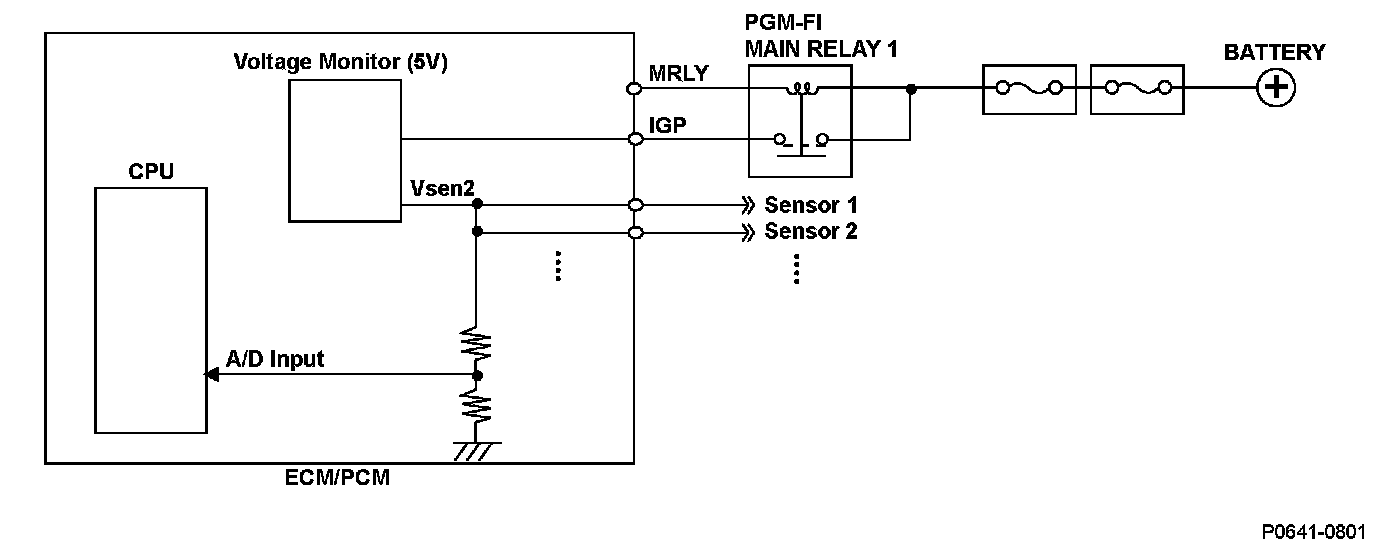 The engine control module (ECM)/powertrain control module (PCM) is equipped with a voltage monitor (5 V power source) to supply a stable 5 V to each sensor as reference voltage. The correct voltage for the sensors are loaded in the CPU of the ECM/PCM (A/D input) and when the condition that sensor power voltage is set value or more (high) or set value or less (low) continues for a certain time, a malfunction is detected and a DTC is stored.