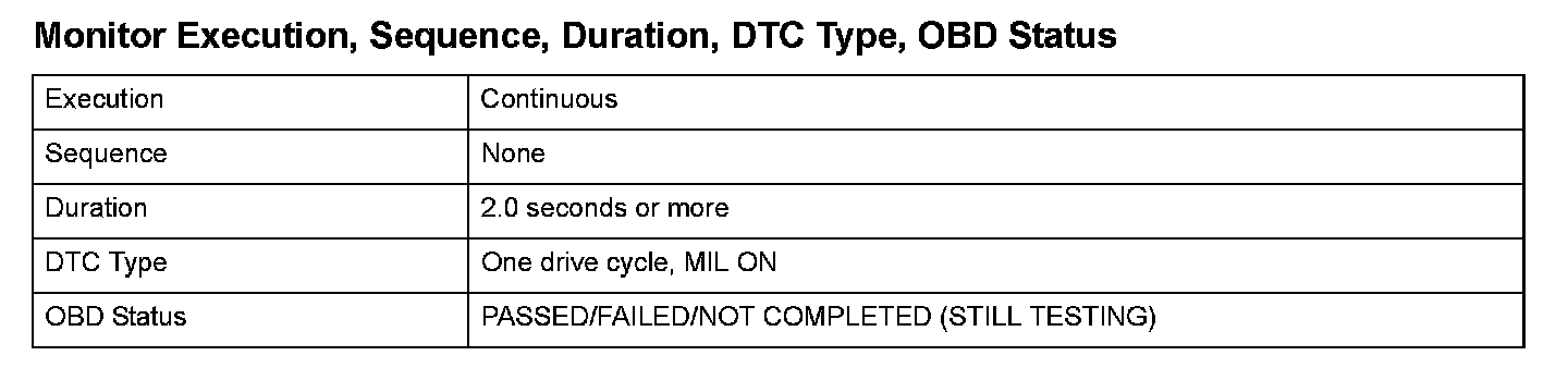Monitor Execution, Sequence, Duration, DTC Type, OBD Status