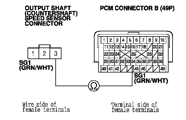 25. Check for continuity between PCM connector terminal B38 and output shaft (countershaft) speed sensor connector terminal No. 2.