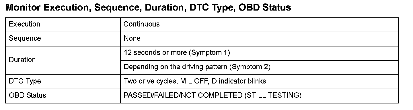 Monitor Execution, Sequence, Duration, DTC Type, OBD Status