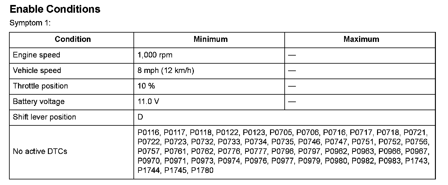 Start the engine, shift to D, and drive the vehicle at a speed of 8 mph (12 km/h) or more for at least 12 seconds in 1st gear.