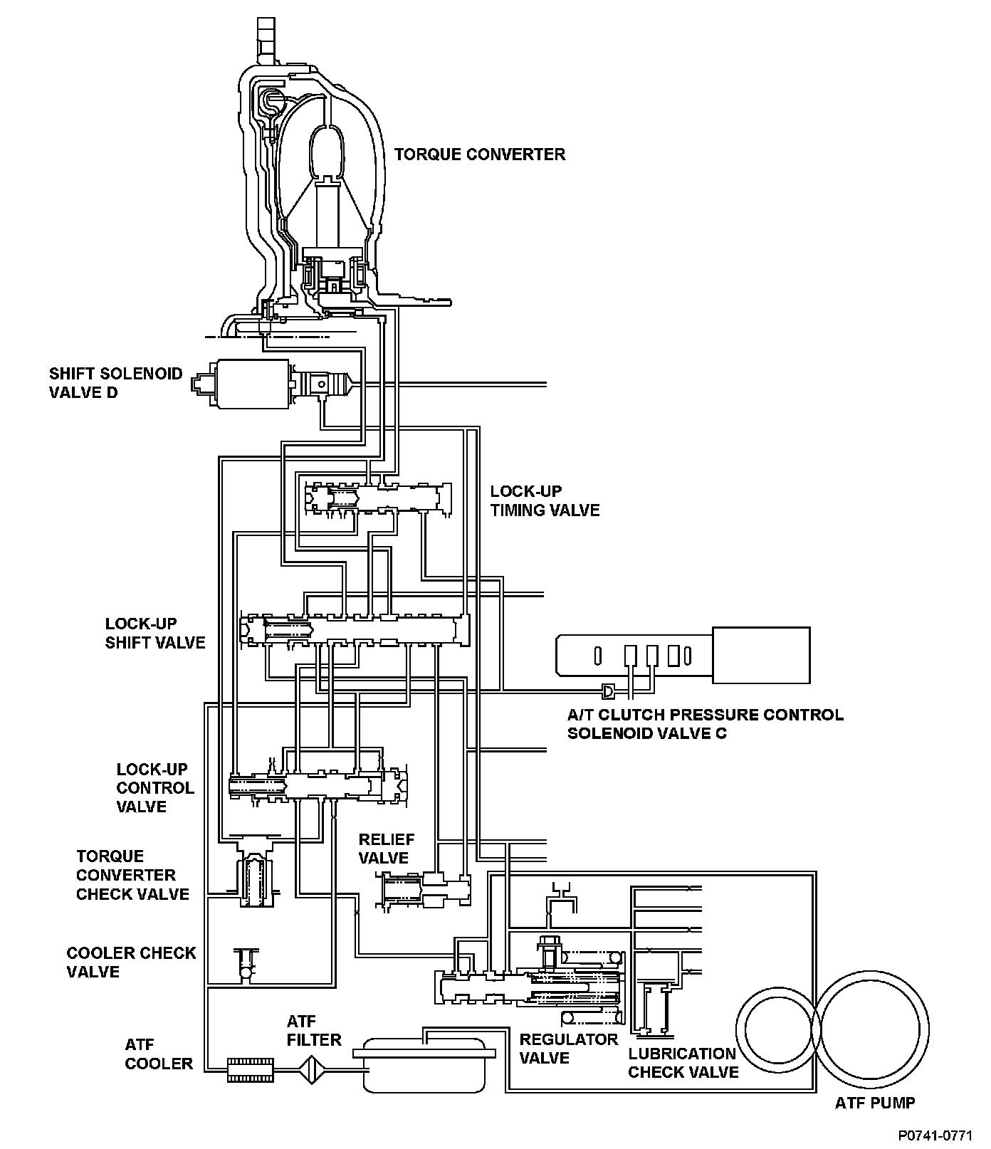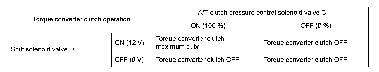 The power transfer capacity of the torque converter clutch is controlled by the balance of automatic transmission fluid (ATF) supply to and discharge from the torque converter. When hydraulic pressure is applied internally, the torque converter clutch turns ON, and when hydraulic pressure is applied from the back pressure side, the torque converter clutch turns OFF. As the hydraulic pressure from the internal pressure side increases, the power transfer capacity of the torque converter clutch increases.The direction of hydraulic pressure supply is switched by the torque converter clutch and the lock-up shift valve. ATF is supplied from the internal pressure side to shift solenoid valve D when the signal from the powertrain control module (PCM) is ON (12 V), and ATF is supplied from the back pressure side when it is OFF (0 V). The balance of internal pressure and back pressure is controlled by A/T clutch pressure control solenoid valve B, the lock-up control valve, and the lock-up timing valve. A/T clutch pressure control solenoid valve C maximizes the power transfer capacity of the torque converter clutch when the signal from the PCM is ON (1 A), and it minimizes the power transfer capacity of the torque converter clutch when the signal from the PCM is OFF (0 A). If the ratio of engine speed and input shaft (mainshaft) speed is not about 1:1 while the PCM is issuing the command to turn shift solenoid valve D and A/T clutch pressure control solenoid valve C ON, the PCM detects a faulty lock-up control system and stores a DTC.