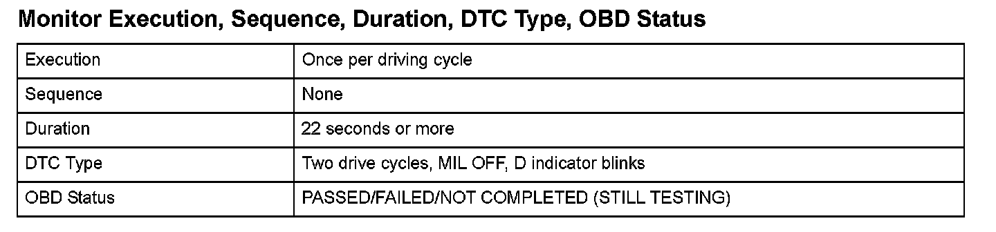 Monitor Execution, Sequence, Duration, DTC Type, OBD Status