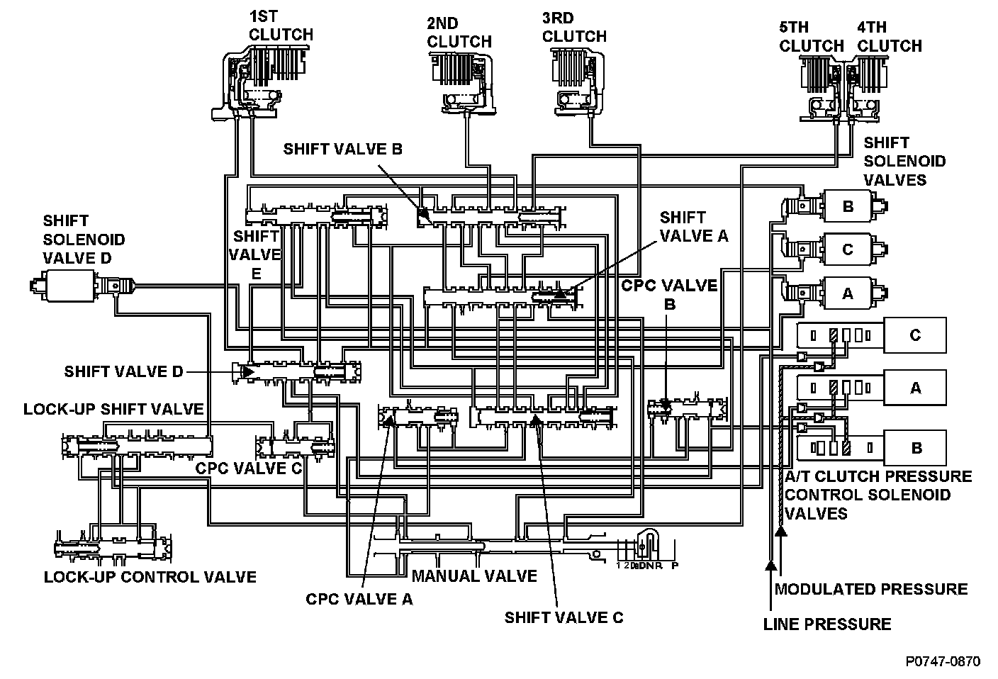 A/T clutch pressure control solenoid valve A is installed in the transmission housing. A/T clutch pressure control solenoid valve A is operated by the powertrain control module (PCM) and converts the modulated pressure to A/T clutch pressure control solenoid A pressure, which operates CPC valve A. Line pressure is modulated to clutch pressure control A pressure (CPC A pressure) by CPC valve A and the CPC valve A spring. A signal from the PCM is output to the proper gear clutch, determined by the gear schedule, to supply the proper CPC pressure according to the driving conditions. When the current from the PCM is high (ON), A/T clutch pressure control solenoid valve A operates and the CPC valve A pressure increases. When the current from the PCM is low (OFF), A/T clutch pressure control solenoid valve A turns off and CPC valve A pressure decreases. The PCM monitors the input shaft (mainshaft) speed and the output shaft (countershaft) speed at the gear change determined by the shift schedule. When an improper gear ratio is output compared to the predetermined gear ratio, an A/T clutch pressure control solenoid valve A OFF failure is detected and a DTC is stored.