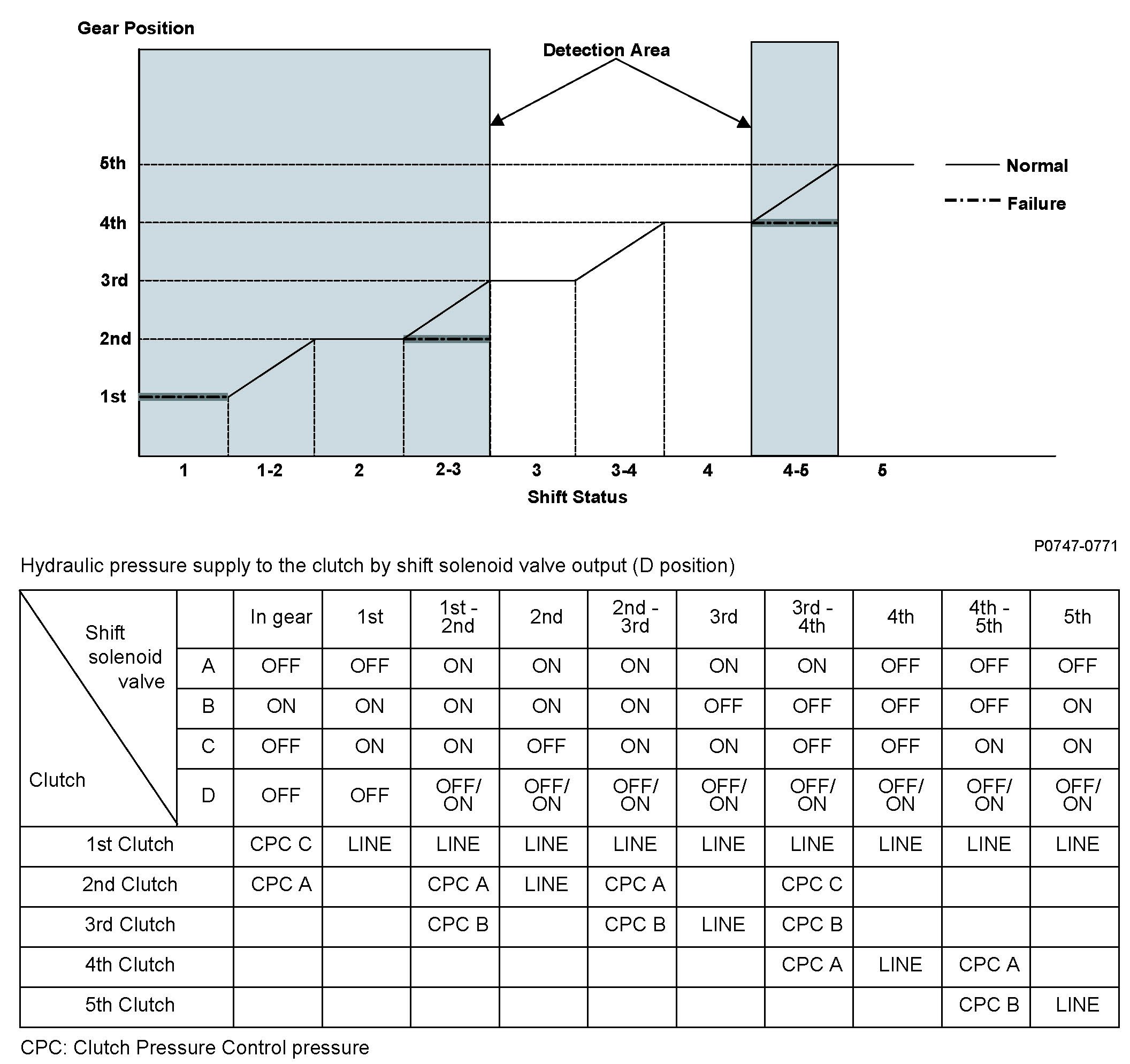 A/T clutch pressure control solenoid valve A is installed in the transmission housing. A/T clutch pressure control solenoid valve A is operated by the powertrain control module (PCM) and converts the modulated pressure to A/T clutch pressure control solenoid A pressure, which operates CPC valve A. Line pressure is modulated to clutch pressure control A pressure (CPC A pressure) by CPC valve A and the CPC valve A spring. A signal from the PCM is output to the proper gear clutch, determined by the gear schedule, to supply the proper CPC pressure according to the driving conditions. When the current from the PCM is high (ON), A/T clutch pressure control solenoid valve A operates and the CPC valve A pressure increases. When the current from the PCM is low (OFF), A/T clutch pressure control solenoid valve A turns off and CPC valve A pressure decreases. The PCM monitors the input shaft (mainshaft) speed and the output shaft (countershaft) speed at the gear change determined by the shift schedule. When an improper gear ratio is output compared to the predetermined gear ratio, an A/T clutch pressure control solenoid valve A ON failure is detected and a DTC is stored.