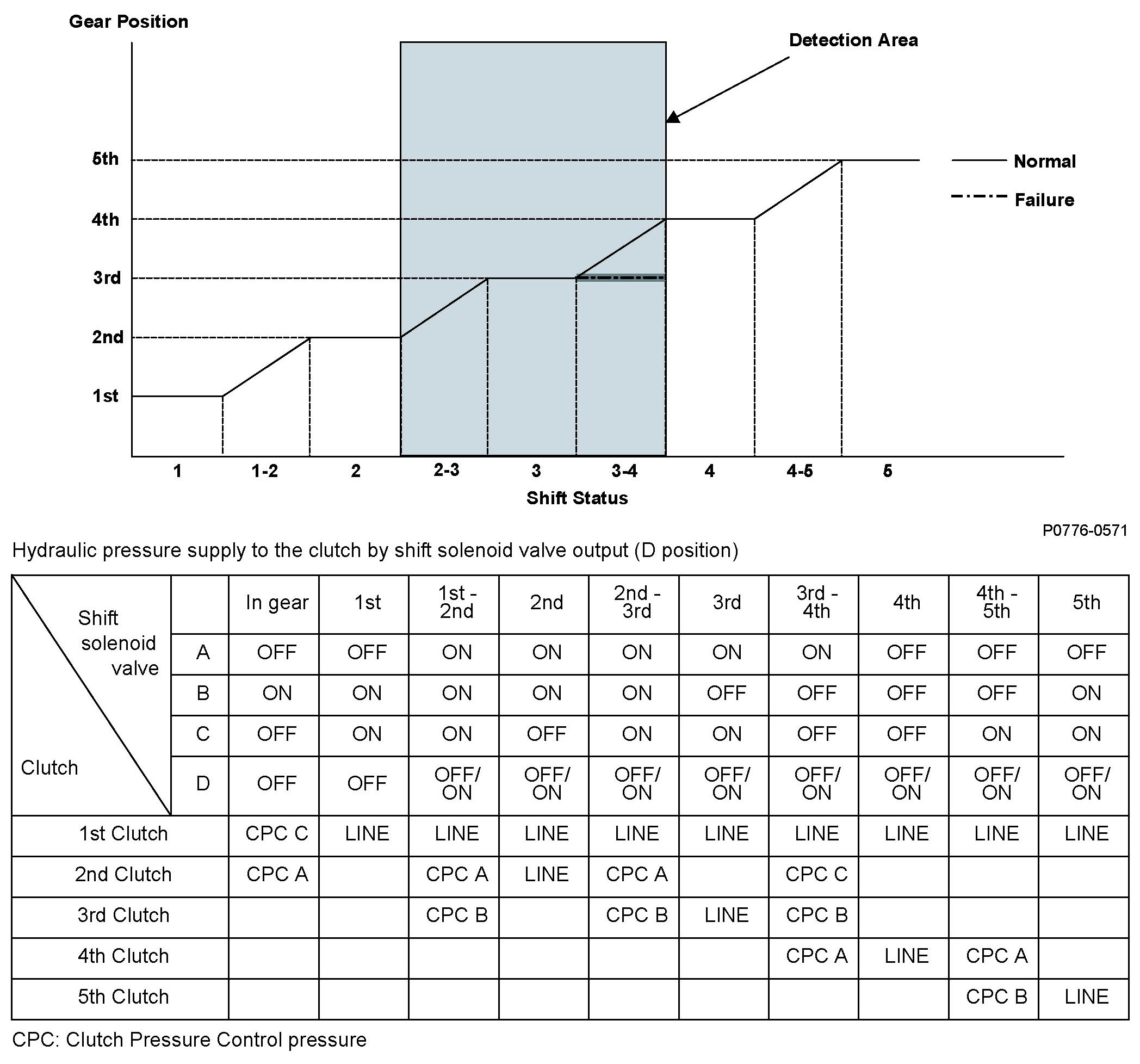 A/T clutch pressure control solenoid valve B is installed in the transmission housing. A/T clutch pressure control solenoid valve B is operated by the powertrain control module (PCM) and converts modulated pressure to A/T clutch pressure control solenoid B pressure, which operates CPC valve B. Line pressure is modulated to clutch pressure control B pressure (CPC B pressure) by CPC valve B and the CPC valve B spring. A signal from the PCM is output to the proper gear clutch, determined by the gear schedule, to supply the proper CPC pressure according to the driving conditions. When the current from the PCM is low (OFF), A/T clutch pressure control solenoid valve B operates and the CPC valve B pressure increases. When the current from the PCM is high (ON), A/T clutch pressure control solenoid valve B turns off and the CPC valve B pressure decreases. The PCM monitors the input shaft (mainshaft) speed and the output shaft (countershaft) speed at the gear change determined by the shift schedule. When an improper gear ratio is output compared to the predetermined gear change mode, an A/T clutch pressure control solenoid valve B OFF failure is detected and a DTC is stored.