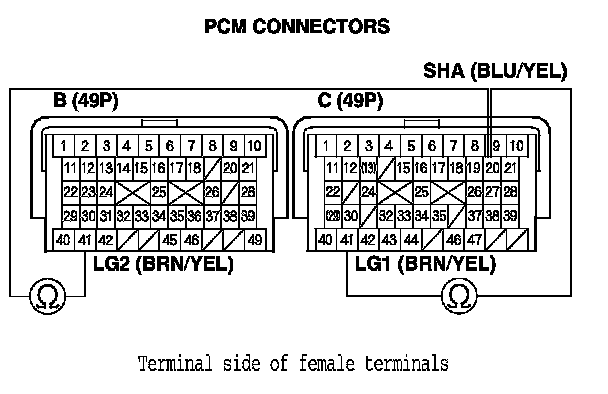 19. Check for continuity between PCM connector terminals B41 and body ground, and between C41 and body ground.