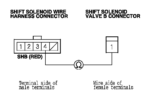 15. Check for continuity between shift solenoid wire harness connector terminal No. 4 and the shift solenoid valve B connector terminal.