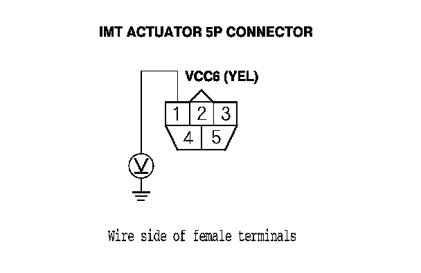7. Measure the voltage between IMT actuator 5P connector terminal No. 1 and body ground.