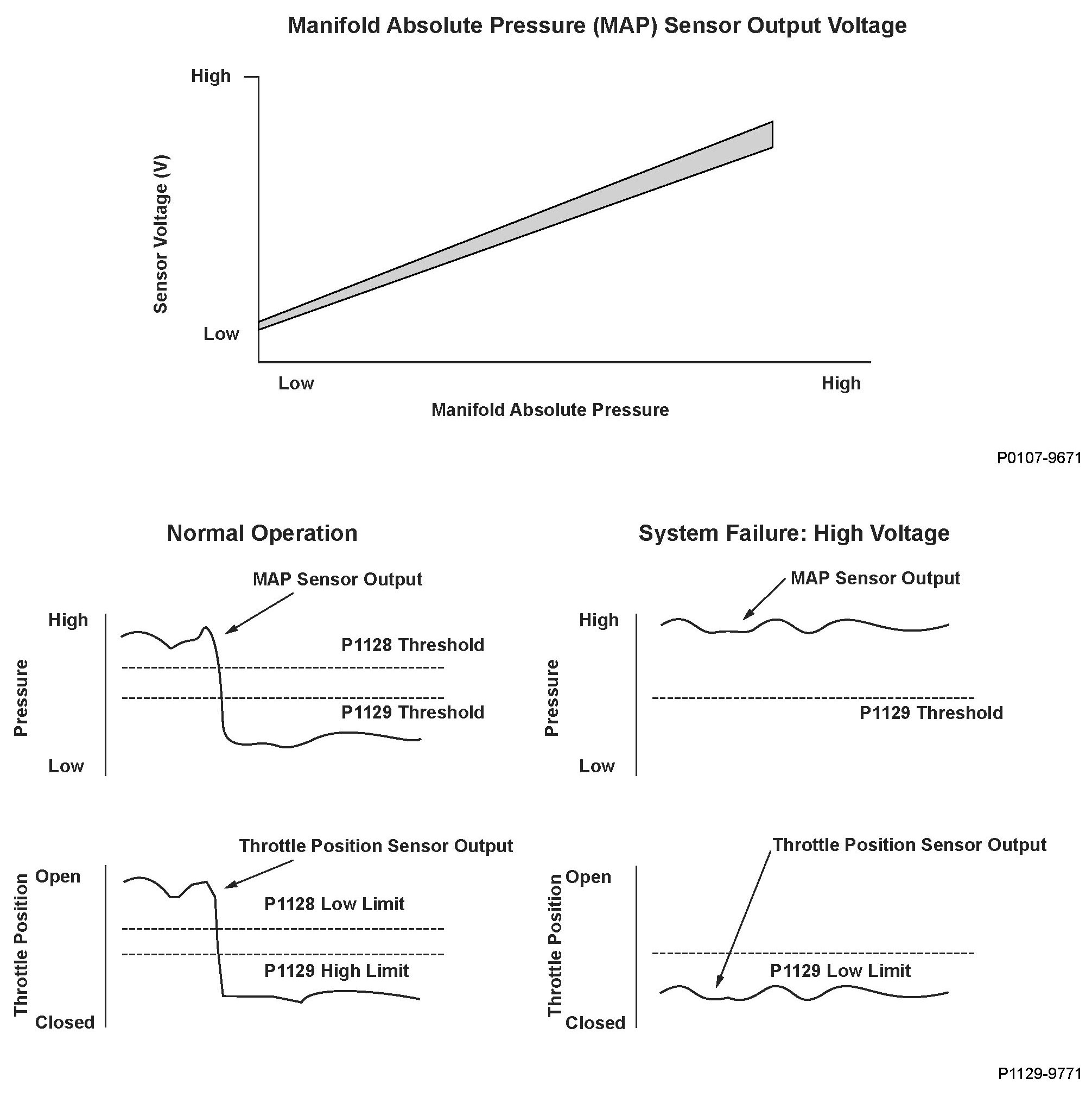 The manifold absolute pressure (MAP) sensor senses manifold absolute pressure (vacuum) and converts it into electrical signals. The MAP sensor outputs low signal voltage at high-vacuum (throttle valve closed) and high signal voltage at low-vacuum (throttle valve wide open). The powertrain control module (PCM) compares a predetermined MAP value at a given throttle position and manifold absolute pressure to the output voltage value of the MAP sensor. If the MAP sensor outputs high voltage during fuel cut-off operation for deceleration with the throttle valve fully closed, which should make the manifold absolute pressure lower, the PCM detects a malfunction and stores a DTC.