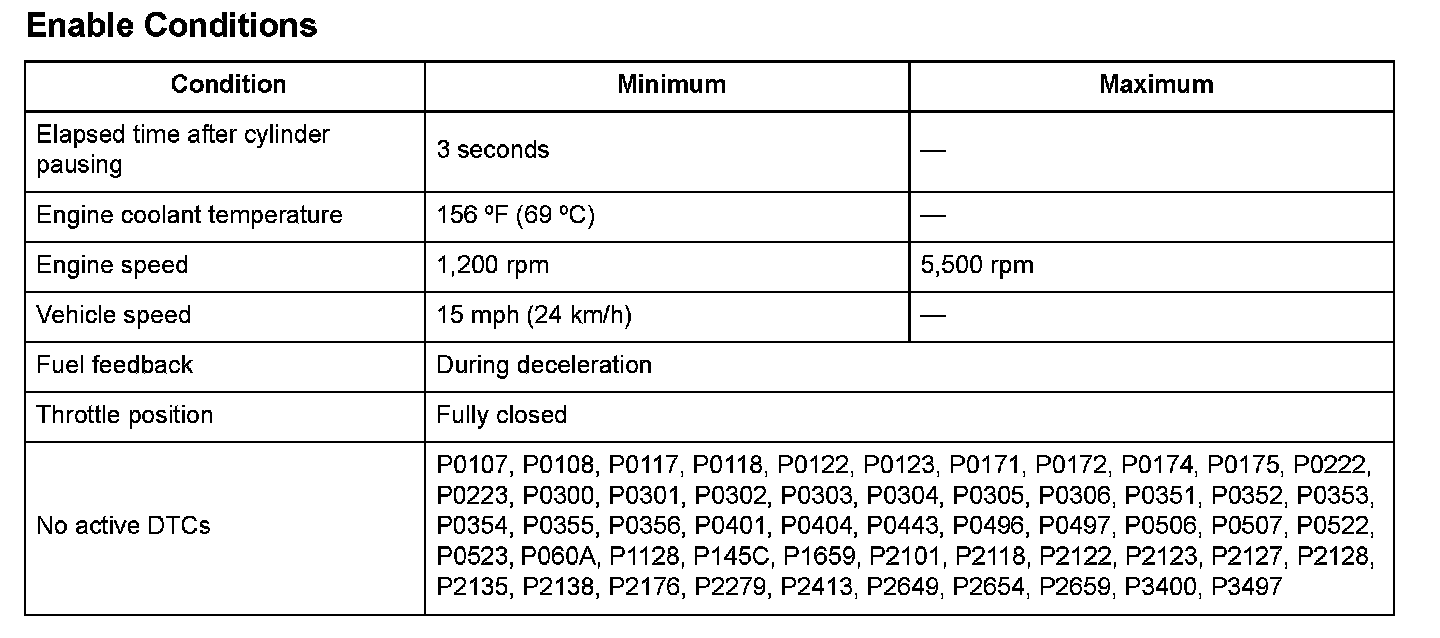 - When 4 or 3 cylinder mode (2 or 3 cylinders are paused), the MAP sensor output is 53 kPa (15.0 in.Hg, 405 mmHg) or more for at least 2.0 seconds.