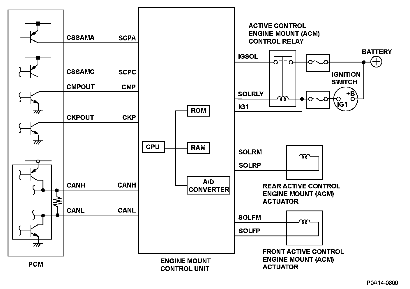 The engine mount control system controls the engine mounts electronically. The system consists of the active control engine mount (ACM) actuators, the engine mount control unit, and the powertrain control module (PCM). The engine mount control unit uses the crankshaft and camshaft position sensor outputs (received from the PCM) to estimate engine vibration. The engine mount control unit then sends signals to the ACM actuators to command the engine mounts to push and pull on the engine to counteract the engine vibration. The PCM monitors the CKP signal input to the engine mount control unit, and when an abnormal condition continues for a set time, the PCM detects a malfunction and a DTC is stored.