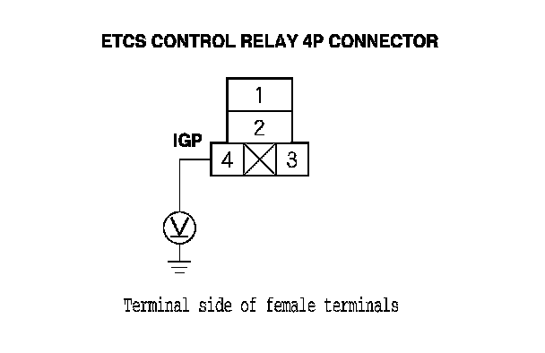 9. Measure the voltage between ETCS control relay 4P connector terminal No. 4 and body ground.