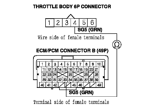 17. Check for continuity between ECM/PCM connector terminal B33 and throttle body 6P connector terminal No. 4.