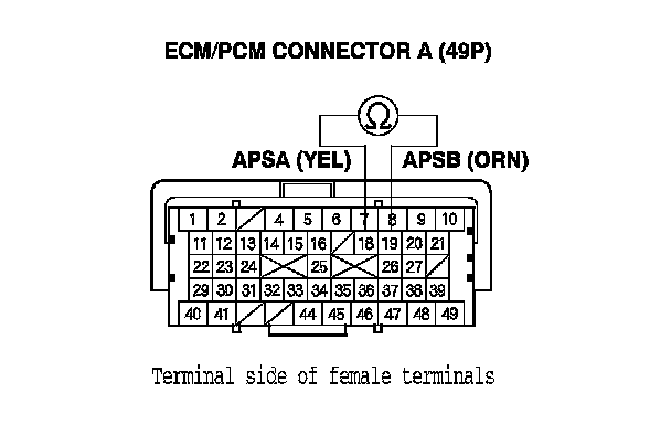 YES - Repair short in the wires between ECM/PCM connector terminals A18 (APSA line) and A19 (APSB line), then go to step 14.