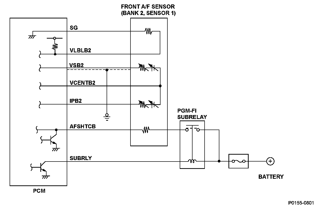 The front air/fuel ratio (A/F) sensor (bank 2, sensor 1) is installed in the exhaust manifold and detects oxygen content in the exhaust gas. The front A/F sensor transmits output voltage to the powertrain control module (PCM). The PCM controls fuel injection duration by comparing the target air/fuel ratio with the front A/F sensor signal. The sensor includes the VS cell, the pump cell, the atmospheric reference cavity, the diffusion layer, and the heater, and it enables overall feedback control. If the VSB2 terminal voltage is a specified value or less for a set time, the PCM detects a malfunction and a DTC is stored.
