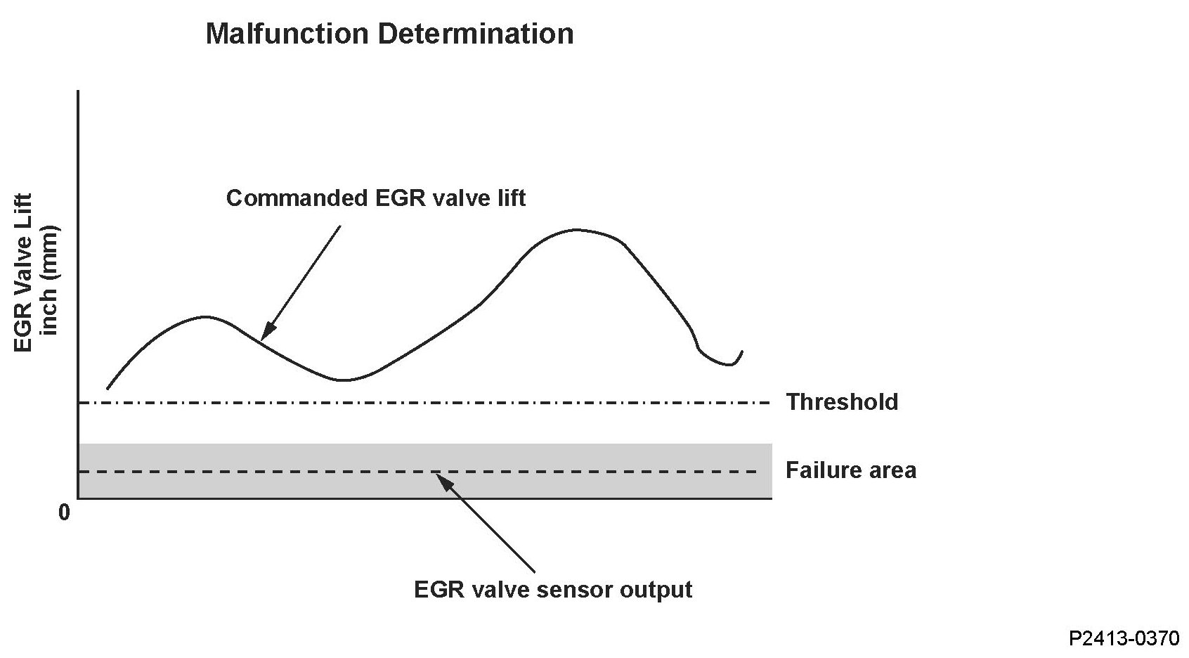 The exhaust gas recirculation (EGR) valve, which is controlled by the powertrain control module (PCM), is opened and the exhaust gas flows from the exhaust manifold through the EGR valve, the intake manifold and the EGR passage. The exhaust gas is circulated into the air/fuel mixture to lower the combustion temperatures, thus reducing oxides of nitrogen (NOx) emissions. A sensor (lift sensor) is built into the EGR valve and detects the amount of valve lift. The command value for the target valve lift is stored in the PCM so that exhaust gas recirculation can be optimized according to driving conditions. Comparing this command value with the lift sensor output signal value, the PCM controls the EGR valve to make the amount of actual valve lift equal to the command value. If the valve sensor output is insufficient for the commanded valve lift, a malfunction is detected.