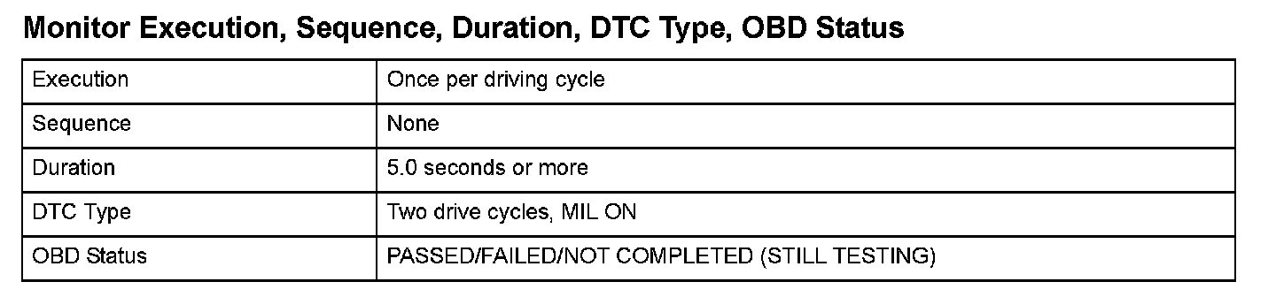 Monitor Execution, Sequence, Duration, DTC Type, OBD Status