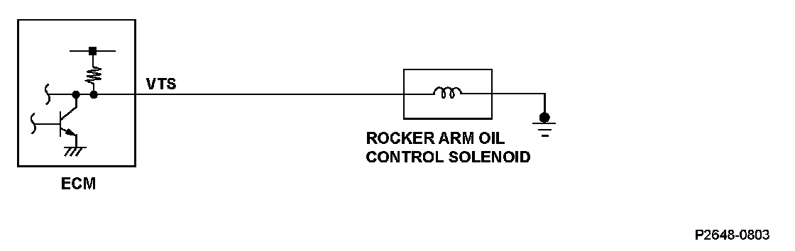 The VTEC system activates the rocker arm oil control solenoid by command from the engine control module (ECM), and it charges/discharges the hydraulic circuit of the VTEC mechanism that switches valve timing between low and high. If the return signal is OFF (low) when the ECM outputs the ON (high) signal to the rocker arm oil control solenoid, the ECM detects a malfunction and a DTC is stored.