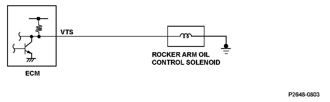 The VTEC system activates the rocker arm oil control solenoid by command from the engine control module (ECM), and it charges/discharges the hydraulic circuit of the VTEC mechanism that switches valve timing between low and high. If the return signal is ON (high) when the ECM outputs the OFF (low) signal to the rocker arm oil control solenoid, the ECM detects a malfunction and a DTC is stored.