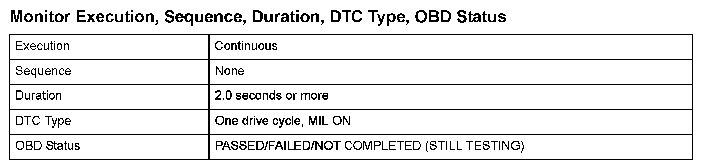 Monitor Execution, Sequence, Duration, DTC Type, OBD Status