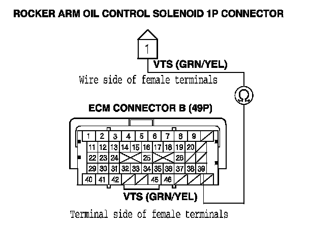 10. Check for continuity between ECM connector terminal B39 and the rocker arm oil control solenoid 1P connector terminal.