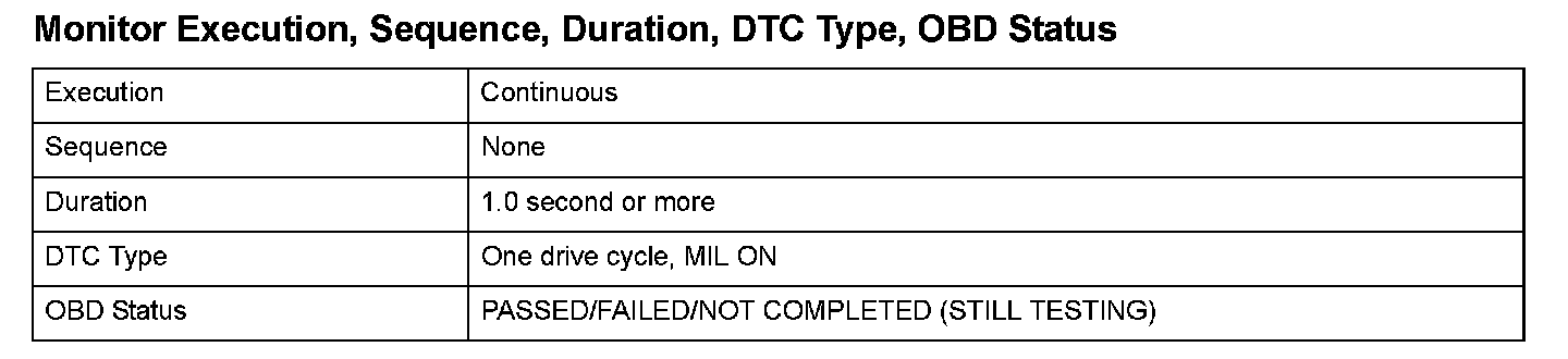 Monitor Execution, Sequence, Duration, DTC Type, OBD Status