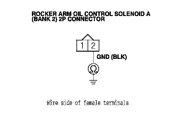 7. Measure the resistance between rocker arm oil control solenoid A (Bank 2) 2P connector terminals No. 1 and No. 2.